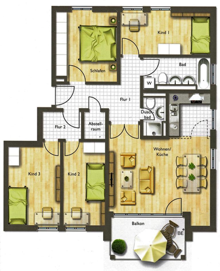 The beautiful apartment is on the 2nd floor of an 8-family house in a new development in Unterföhring. The building has an elevator that leads to the garage. The apartment has a parking space in the underground garage. Was the 5 room apartment with 100 m2 living space, a living / dining room, one bedroom, two children-an office / study, fully furnished, quality fitted kitchen, a bathroom, a shower room with guest toilet, two floors, a storage room , a balcony and a large basement room.