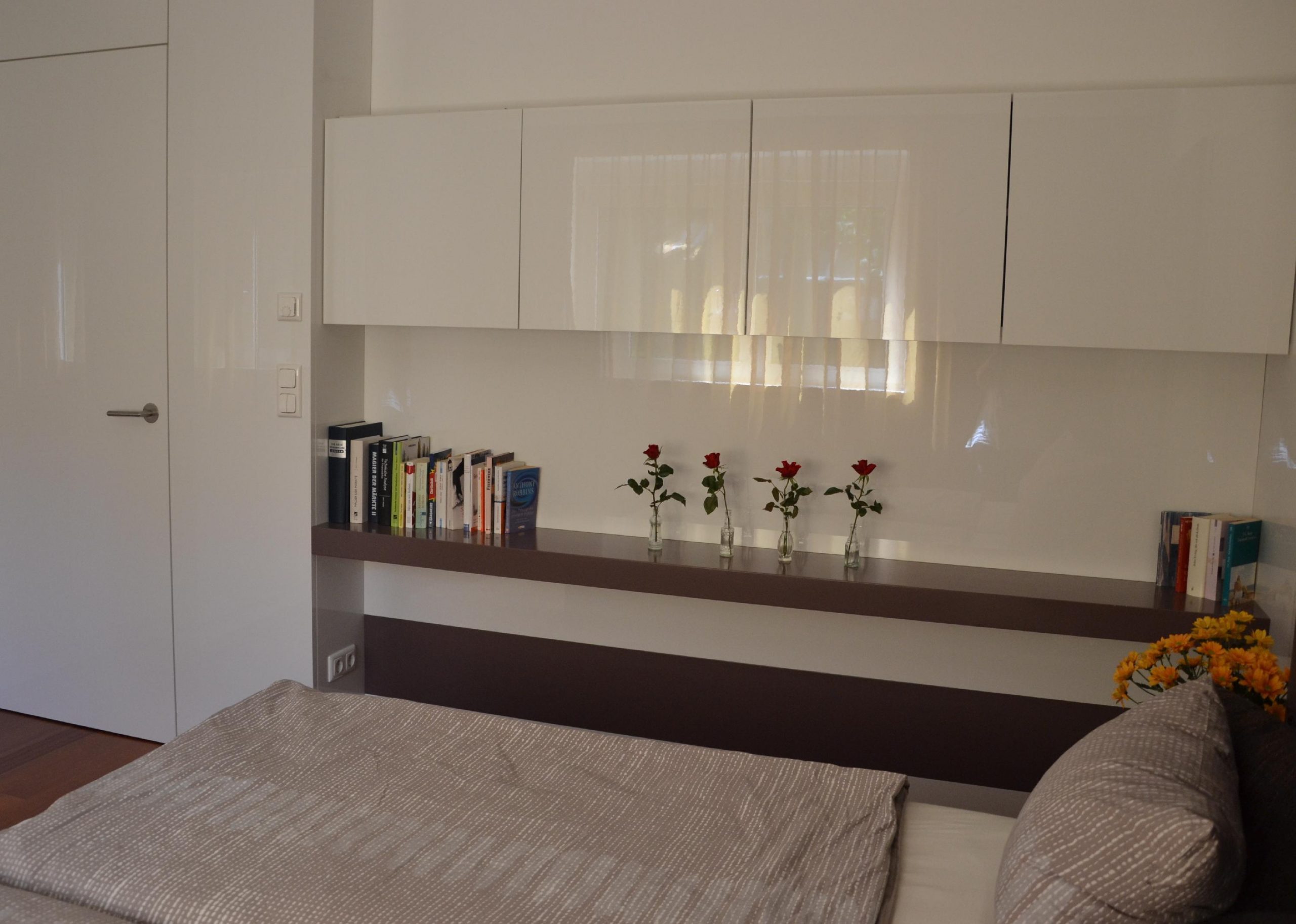 Die Möbel umfassen Einbauschränke in Flur und Schlafzimmer mit viel Stauraum sowie Regale in Wohnzimmer und Bad.