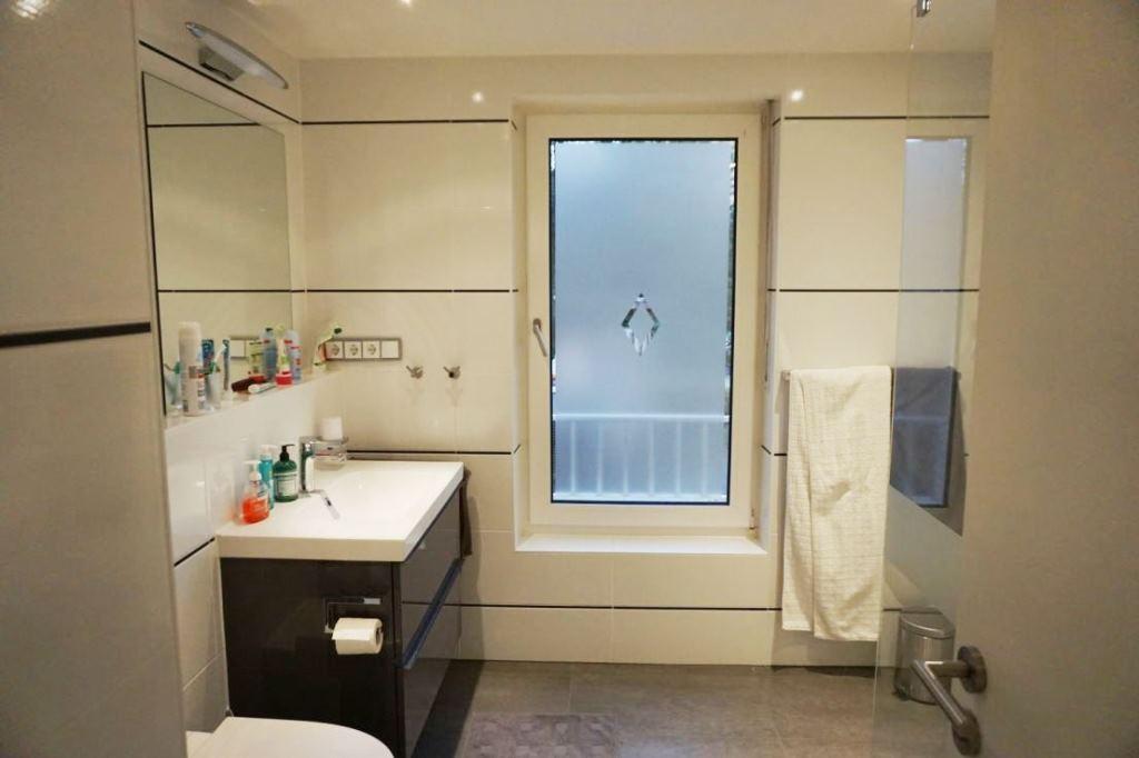 Badezimmer: großes Fenster; Dusche bodenbündig, Glastrennwand; Handtuchtrockner; Waschbecken mit Unterschrank; Badezimmerschrank.