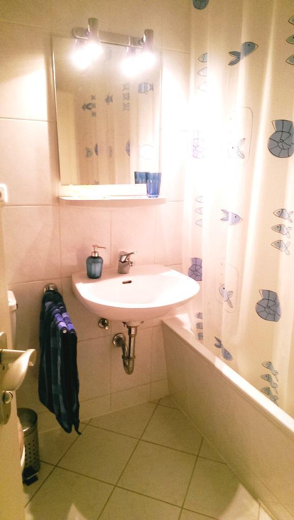 Badezimmer: Badewanne mit Duschvorrichtung, Waschbecken, Spiegel und Ablage, WC.