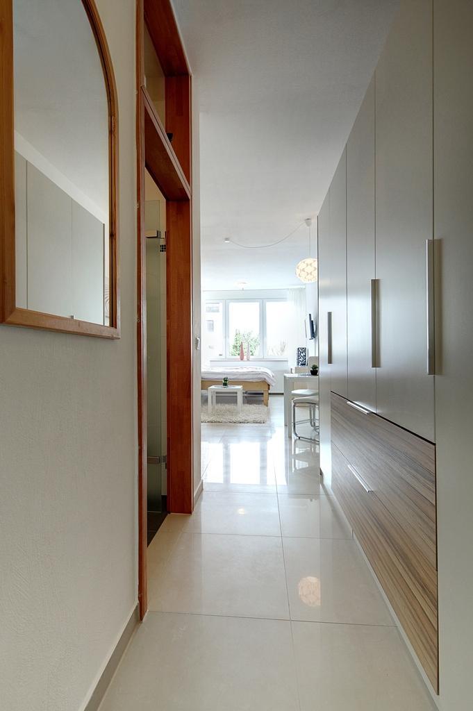 Das geräumige Apartment ist im modernen Stil möbliert und vollständig eingerichtet. Es verfügt über einen kombinierten Wohn- und Schlafbereich, Küche, Flur, Bad und Keller. Alle Räume sind mit modernem Feinsteinzeug und mit neuer Schallschutz- und Isolierverglasung ausgestattet. Im kombiniertem Wohn-/Schlafzimmer befinden sich: bequemes Doppelbett 200 x 210 cm (auf Wünsch zwei Einzelbetten möglich), Sofa, Couchtisch, Kommode, Esstisch mit 2 Stühlen, großer Kleiderschrank, Garderobe, Schuhschrank, 32″ Flatscreen LCD TV, ein DVD-Player und Internet-Flatrate DSL/WLAN. In der modernen Küche befinden sich: Kühlschrank mit Gefrierfach, Mikrowelle mit Grill, Cerankochfeld, Backofen, Dunstabzugshaube, Kaffeemaschine, Wasserkocher, Toaster sowie ein vollständiges Geschirr- und Kochset. Das sehr hochwertig und modern gestaltete Bad mit Glasdusche, Waschmaschine und WC ist in strahlendem Weiß gehalten. Als kostenfreien Service stellen wir Ihnen außerdem Bettwäsche, Handtücher, Bügeleisen und Bügelbrett, Wäscheständer, Wäschekorb, Fön sowie einen Staubsauger zur Verfügung. Im Haus befinden sich drei Terrassen und ein Garten zur Mitbenutzung. Drei weitere Waschmaschinen und ein Trockner sowie ein Fahrradraum befinden sich im Haus. Ein Stellplatz in der Tiefgarage kann zusätzlich angemietet werden.