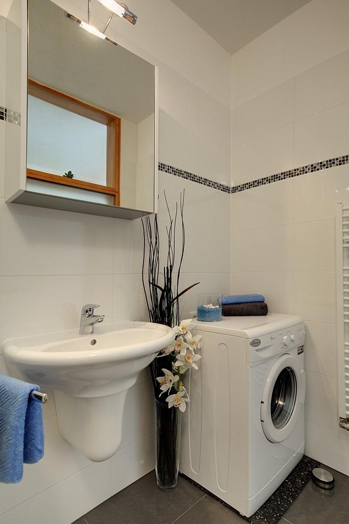 Waschen: Waschmaschine in der Wohnung. Im Waschkeller befinden sich Münzwaschautomaten und Wäschetrockner.