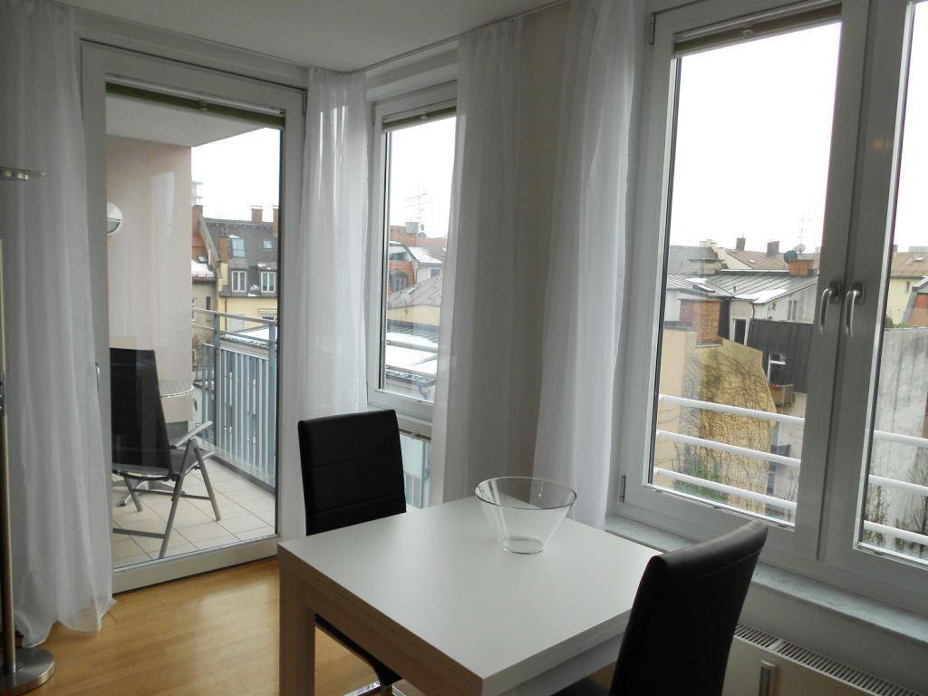 Die ruhige und helle, top möblierte 2 Zi. Wohnung mit Süd Balkon befindet sich in einem gepflegtem Haus mit Lift im Innenhof von der Nymphenburger Straße (ruhig mit Blick über die Dächer von München – mit Tiefgaragenstellplatz).